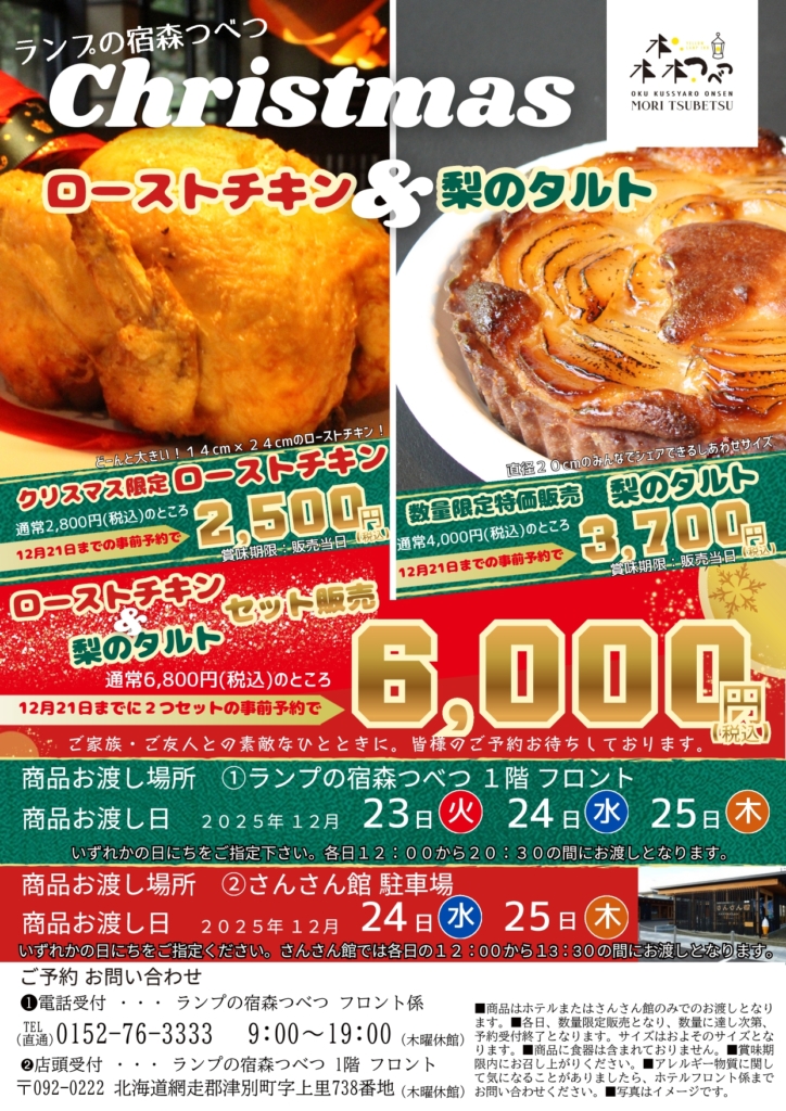 心温まるクリスマスを過ごすためのローストチキン&梨タルトセット、皆さまからのご予約をお待ちしております。どうぞお見逃しなく!
