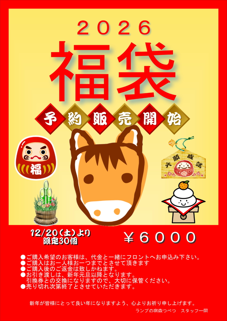 今年も当ホテルでは、12月20日(土)よりご好評の2026年福袋の予約販売を開始いたします。お客様に素敵な体験をお届けするために、特別な内容をご用意いたしました!